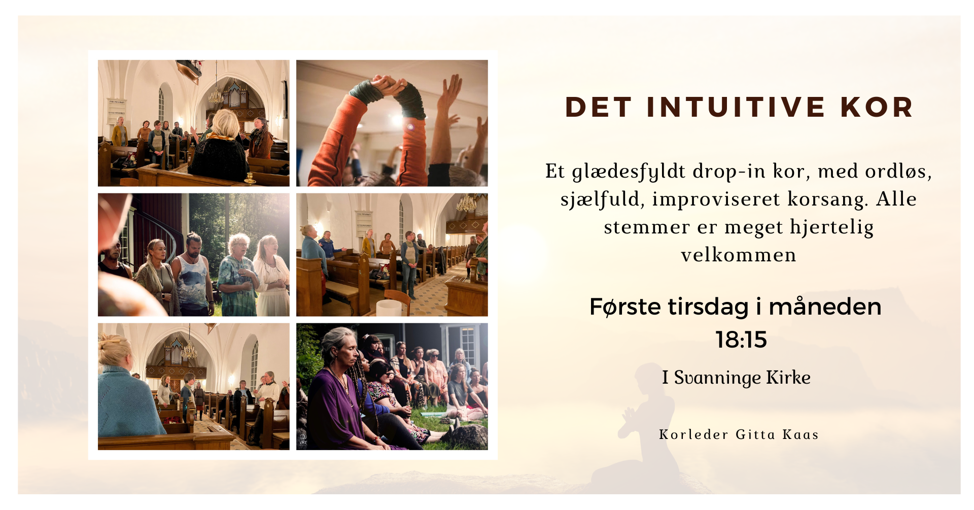 Vi skal smile, lege, virkelig tune ind i og forbinde os med hinandens stemmer og musikken, synge og mærke glæden over det fine rum som den intuitive sang åbner i os og omkring os.